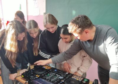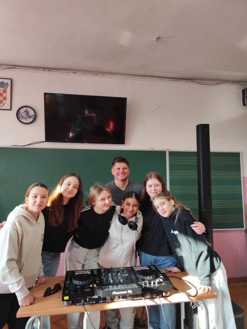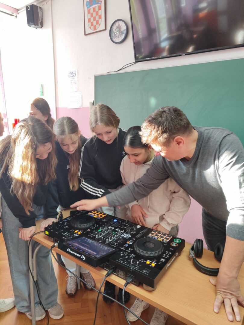 Učenici su imali priliku naučiti što sve treba da postaneš DJ. Atmosfera se ubrzo zahuktala uz stručno vodstvo Roberta Juričića – DJ Frica. Kroz interaktivne pokazne vježbe učenici viših razreda upoznali su osnovne elemente kontrolne DJ ploče te su dobili uvid u raznoliku opremu jednog glazbenika. Učenicima je pružana prilika upravljanja kontrolnom pločom kao i odabirom glazbe. Dežurni učitelji bili su Saša Bukvić i Jelena Paunović Štifanić koji su uvelike pomogli u provedbi ovog cool predavanja.