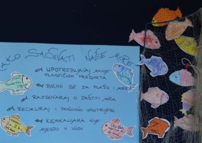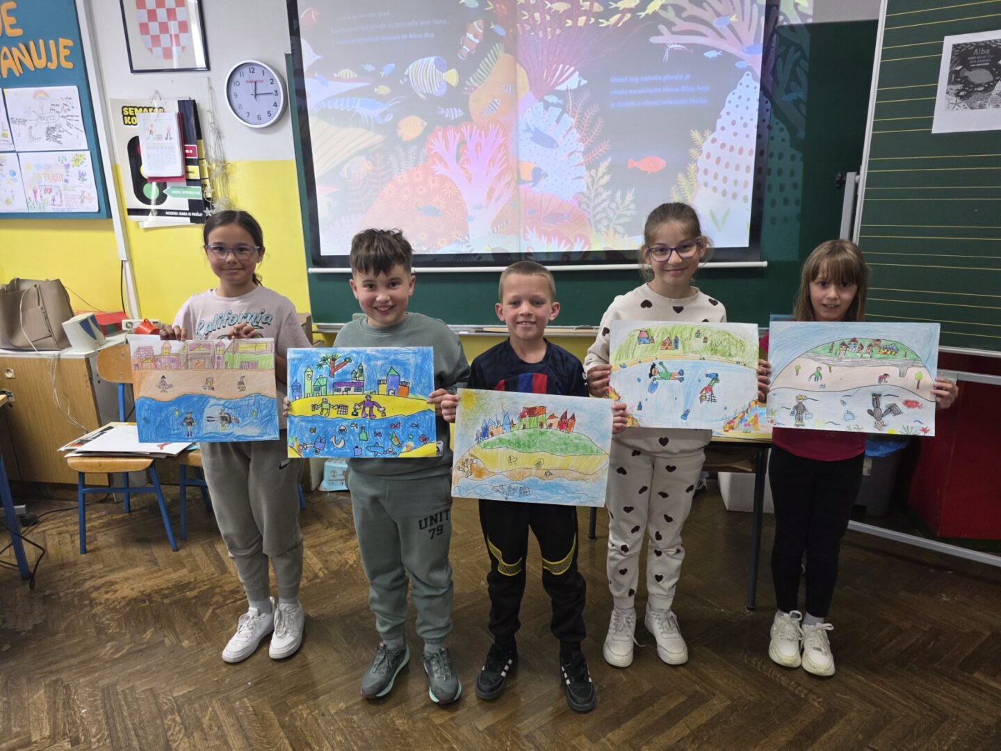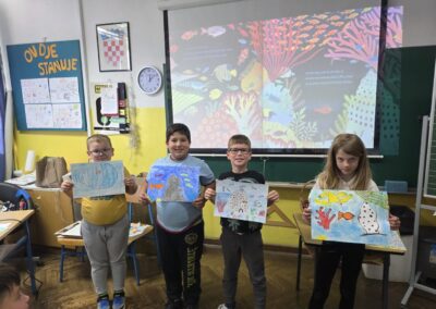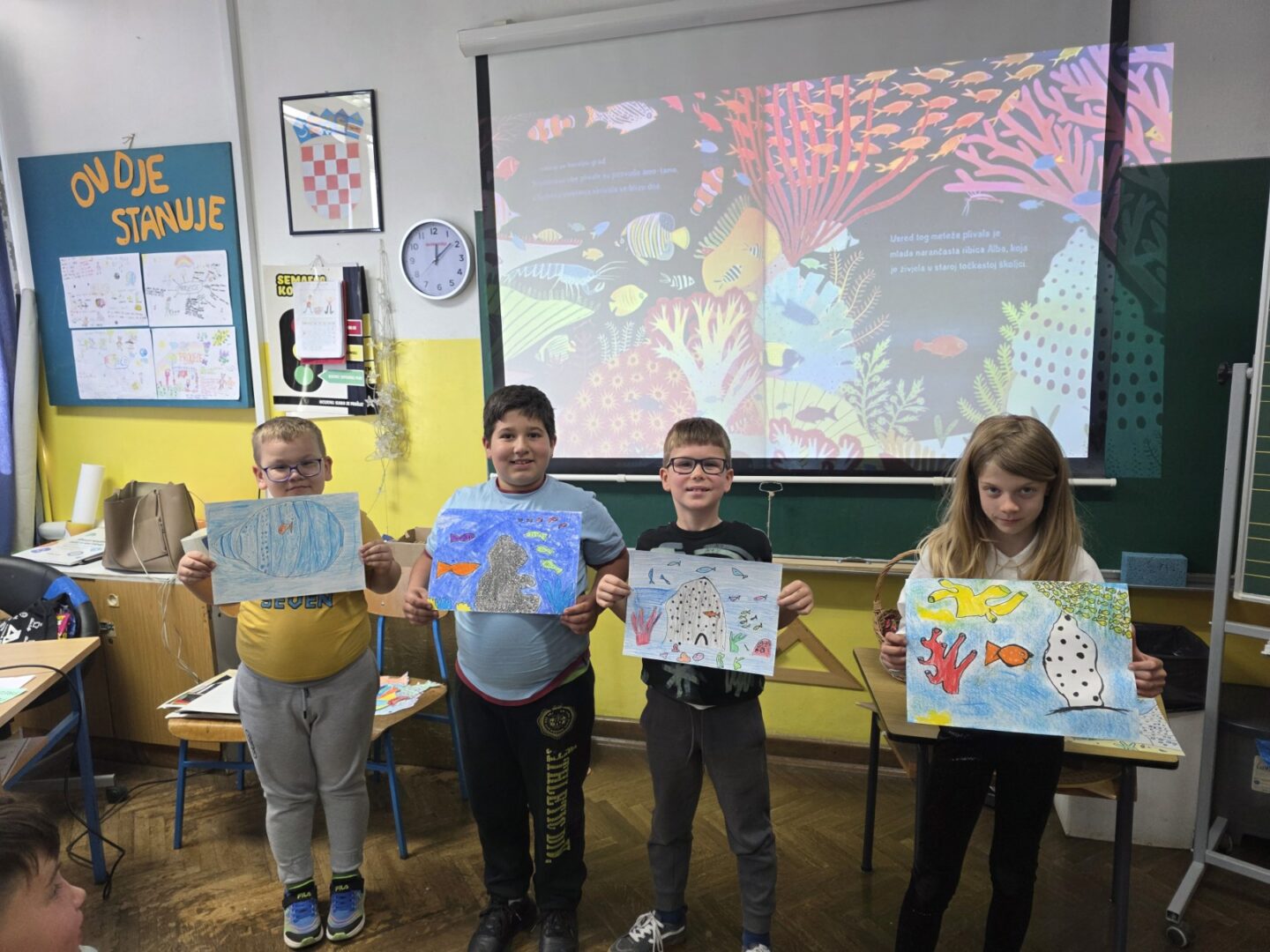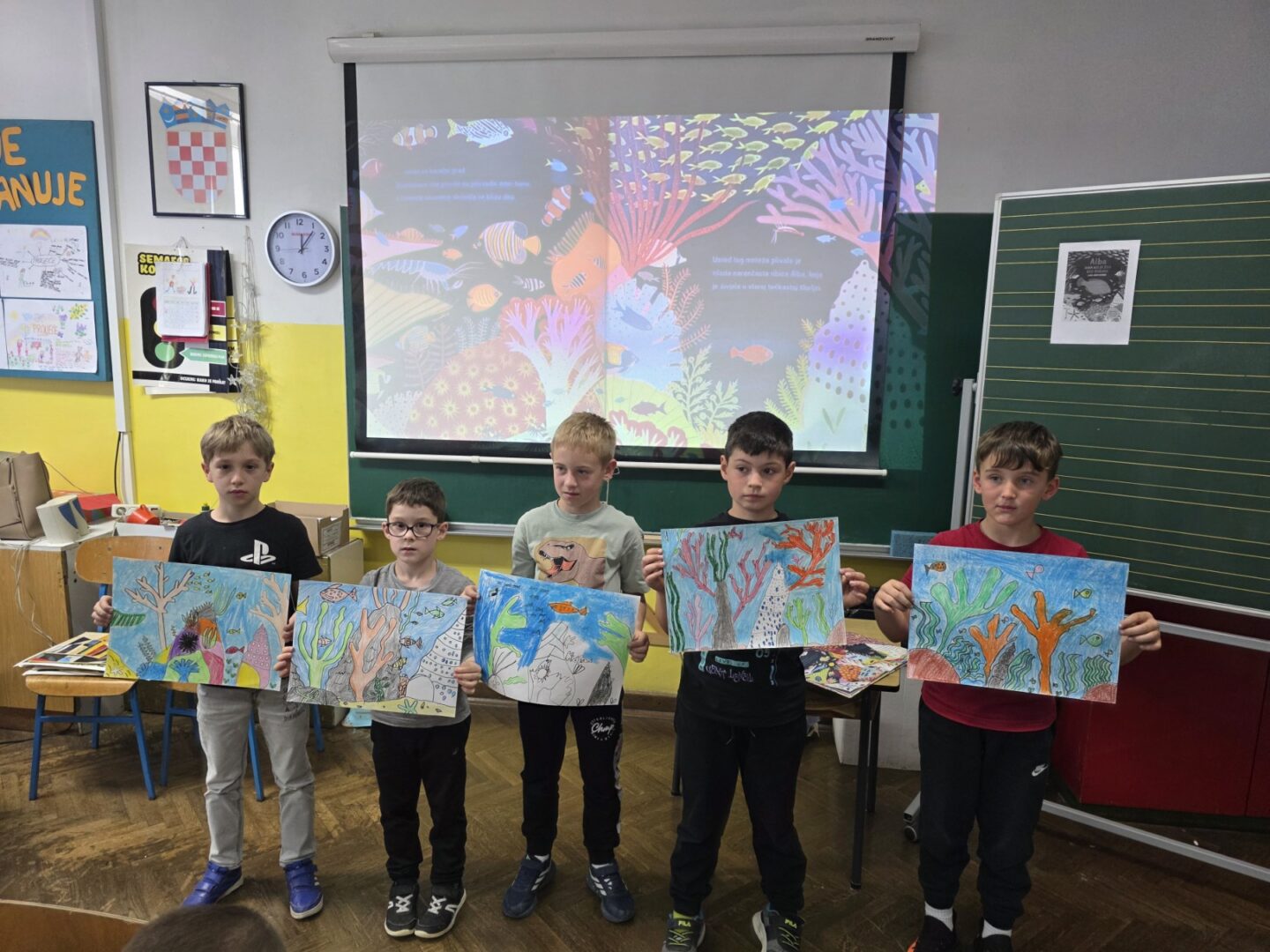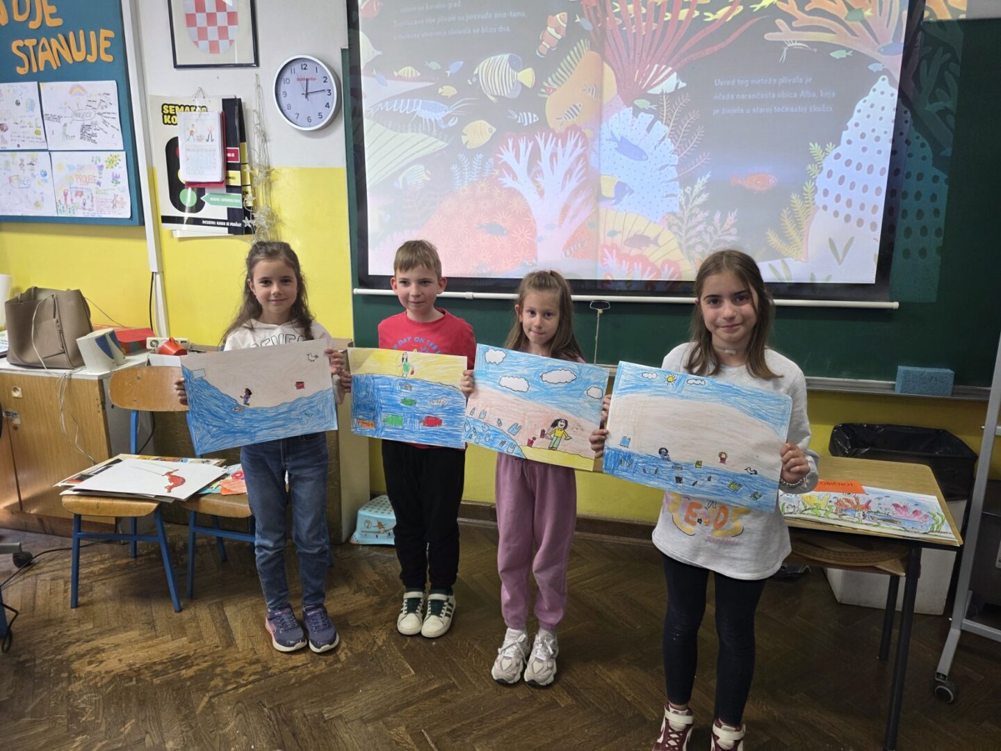 Upravo nas je ta inspirativna priča, koju smo poslušali i čijim smo se ilustracijama divili, potaknula na promišljanje o tome što možemo učiniti za spas mora, voda i okoliša oko nas. Nizale su se različite ideje o potrebi sakupljanja, recikliranja, uporabe platnenih vrećica, brizi za floru i faunu voda i kopna. Učenici su izradili i edukativan plakat o zaštiti voda.