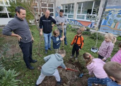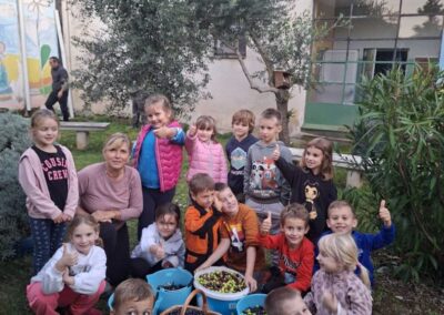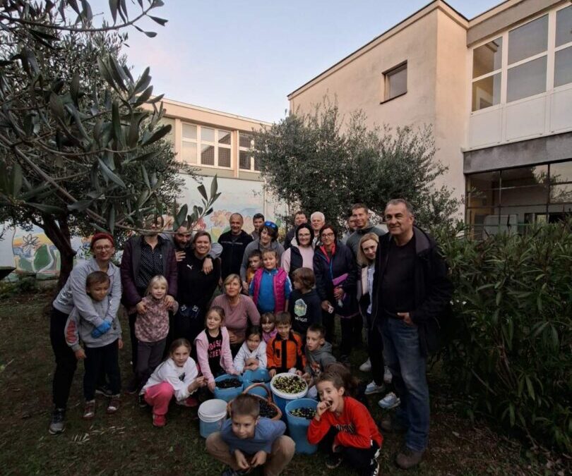 Učenici 1. a razreda, njihovi roditelji i učiteljica Marina Ružić okupili su se kako bi zajedno ubrali plodove s naših triju maslina. Vrijedne ruke malih berača i njihovih roditelja prikupile su čak 40 kilograma maslina! Osim branja maslina, u vrtu smo posadili i jednu jabuku.