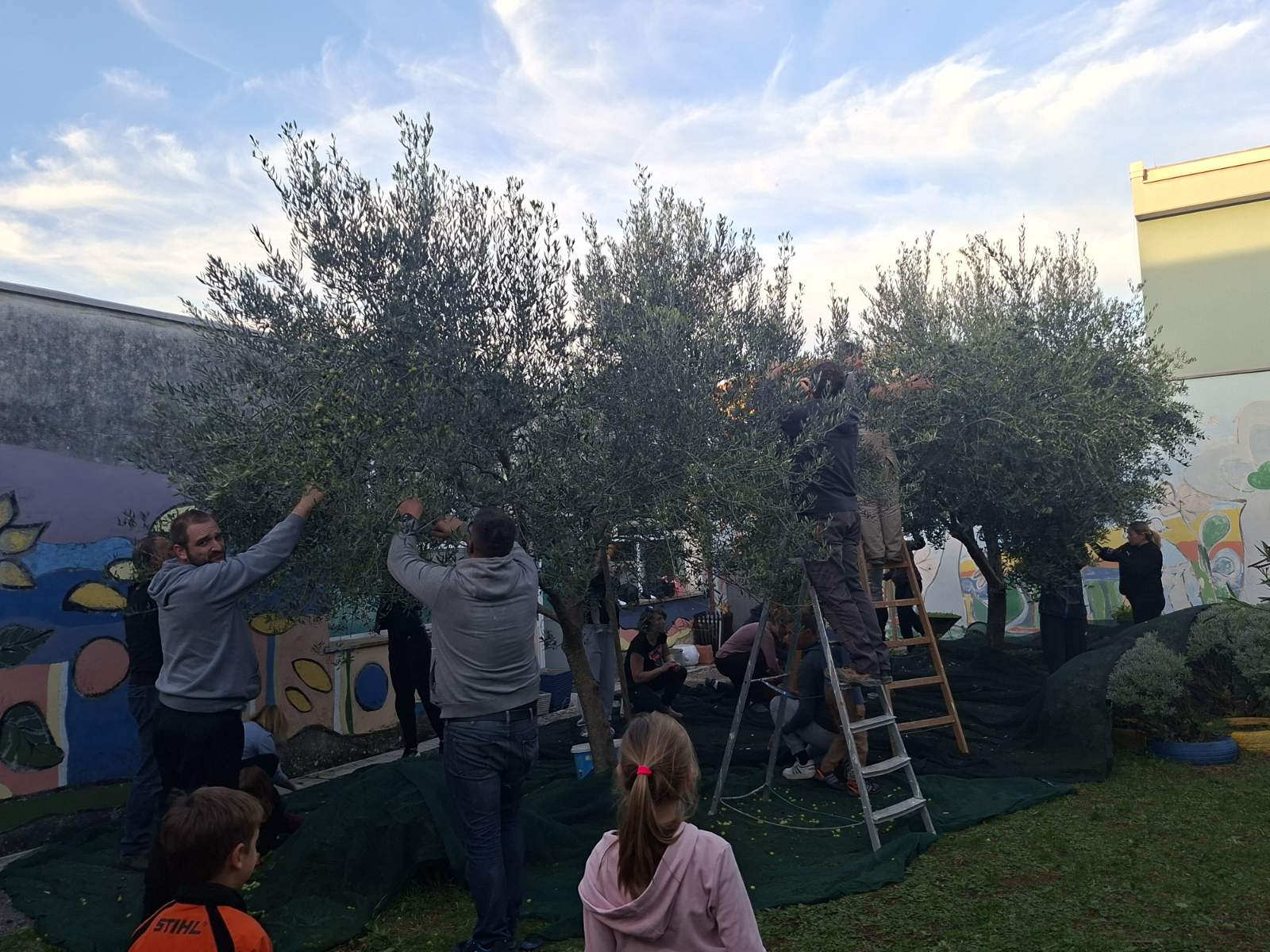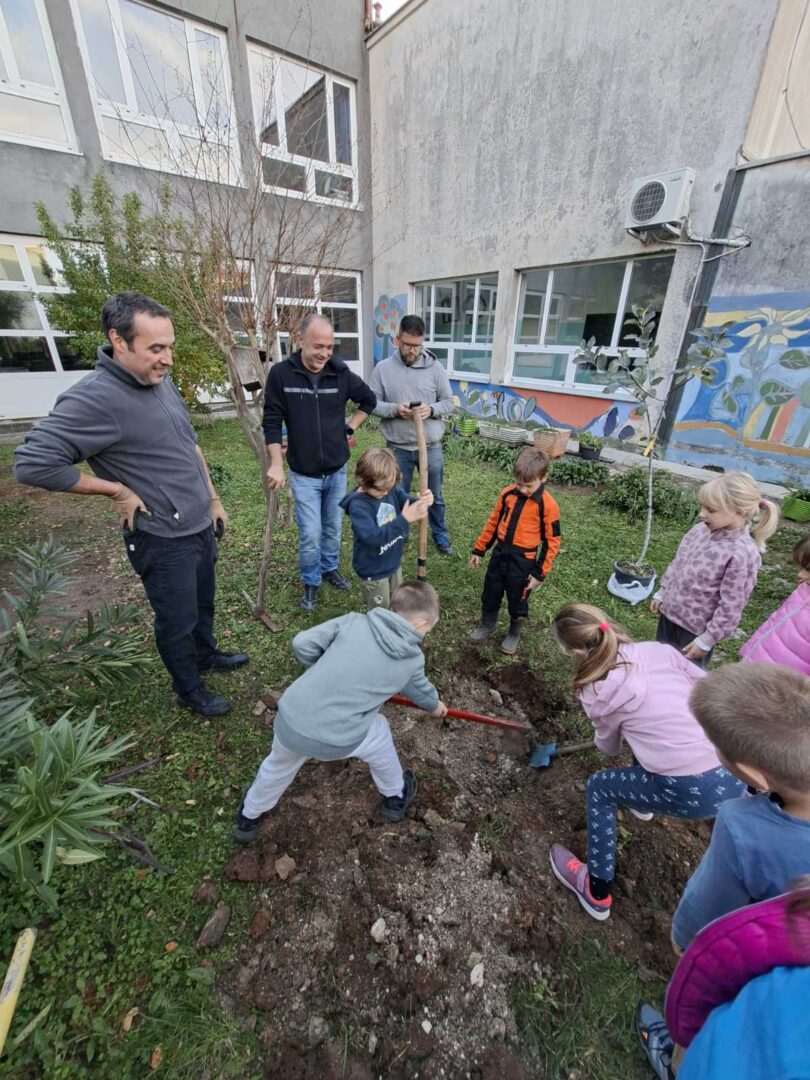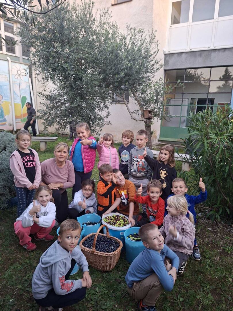 Učenici 1. a razreda, njihovi roditelji i učiteljica Marina Ružić okupili su se kako bi zajedno ubrali plodove s naših triju maslina. Vrijedne ruke malih berača i njihovih roditelja prikupile su čak 40 kilograma maslina! Osim branja maslina, u vrtu smo posadili i jednu jabuku.