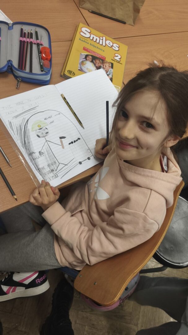 Na nastavi Engleskoga jezika učenici 1. i 2. razreda naučili su nekoliko riječi povezanih s rudnikom i važnošću rudara (miner, mine, lamp, helmet, coal).